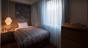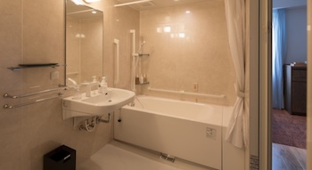 ○障害者対応客室部屋の広さ:18.02㎡・定員数2名のユニバーサルルームも一室あり(スタンダードダブルと同タイプ)は車椅子にてホテル入口から段差等の障害が無くお部屋まで移動でき、バスルームは車椅子の入室が可能で、バスタブは腰がかけられるほど広く、縁を跨げない障害者でも入浴が可能です。通路幅を広く確保し、スイッチや家具の配置にもこだわるなど、やさしく使いやすいお部屋を目指しました。ベッドサイズは140cmx200cm。