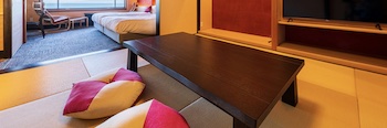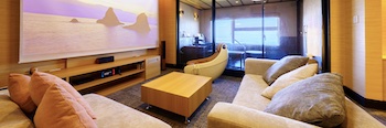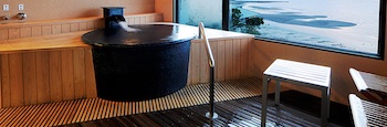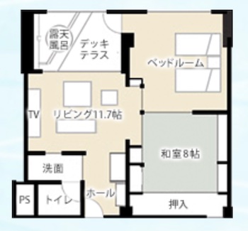 ○障害者対応客室部屋の広さ:84㎡・定員数6名の『癒し・安らぎ』をコンセプトにした当館に2部屋だけの特別室「DXスイート」。「和室」+「寝室」+「リビング」+「信楽焼・半露天風呂付デッキテラス」からなる「84㎡」のゆったりゼイタク空間。信楽焼・客室専用半露天風呂(直径130cm 深さ55cm)、浴槽脇に腰掛けスペースがあり。シモンズ社製(米)高級マットレス(ゆったりセミダブルサイズ〜120cm幅)
