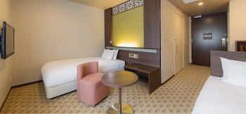 ○障害者対応客室部屋の広さ:26㎡・定員数2名の601号室ユニバーサルツインルームは車椅子にてホテル入口から段差等の障害が無くお部屋まで移動でき、バスルームは車椅子の入室が可能(ドア開口87cm)で、シャワーチェア(貸出備品)があり、バスタブ(高さ38cm)は腰がかけられるほど広く、縁を跨げない障害者でも入浴が可能です。ベッドサイズ:ベッド幅120cm×長さ200cm(ベッド間間隔:190〜208cm)。通路幅を広く確保し、スイッチや家具の配置にもこだわるなど、やさしく使いやすいお部屋を目指しました。 障がいをお持ちの方、お年を召した方、お子さま連れなど、どなたにもおくつろぎいただけます。