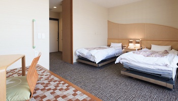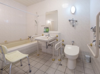 ○障害者対応客室:バリアフリー対応客室は走行リフトで電動ベットから浴室・トイレまで移動可能。広さ約33m²・定員2名・ベッド台数は介護支援電動ベッド1台、セミダブルベッド1台。車椅子でも安心してお使いいただけるよう段差をなくし、お風呂・トイレに手摺を設けたバリアフリーのお部屋です。浴室にはシャワーチェア・腰掛けスペース・天井走行リフトがあり。