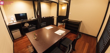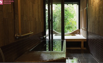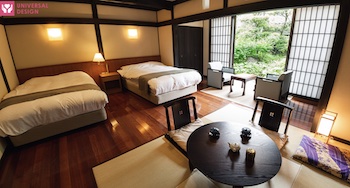 ○障害者対応客室:しっとり落ち着いた34m2和洋室タイプのUDルーム(定員4名)。セミダブルベッド2台はベッド位置移動可能。部屋には源泉かけ流しの内風呂・露天風呂(石風呂、さわらの木風呂)があり。洗い場まで車椅子で行くことができ、浴槽の縁が広くここに腰掛けて湯船に入れます。入口より客室まで全て車椅子で移動ができ、車椅子のままお食事が出来るダイニングテーブルもあり。