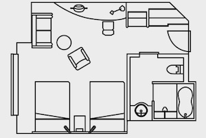 ○障害者対応客室:41m²ユニバーサルツインルーム1室あり(8F)。トイレ、バスルームは別々で手すりがあり。定員:1〜3名。ベッドサイズ:140×205cmx2台。バスルームにはシャワーチェアがあり、浴槽脇に腰掛けスペースがあり。