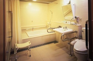 ○バリアフリールーム車椅子利用者用客室あり。ユニバーサルデザイン採用のゲストルーム。段差のない床面、手すり付のバス・トイレ。客室面積:ユニバーサルルーム(35平米)、定員:1~4名。各扉や通路は、車椅子での移動に十分な幅を確保し、バスルームやお手洗いは、お客様自身で動きやすい機能的な設計。浴槽の脇には広い腰掛けスペースがあり、ここに腰掛けて、湯船に移乗できます。洗い場は無く、シャワーは浴槽内で使うタイプで、シャワーチェアもあります。