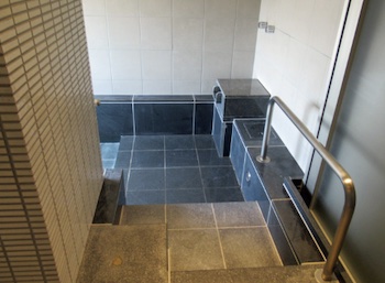 ○エントランス:道後温泉本館からホテルまでは坂道ですが、別ルートあり(道後温泉本館前にあるひろばからホテルへ出入りできます。道後温泉前の広場がB2となり、フロント(1F)へはエレベーターをB1で乗り換える)。正面入り口スロープが2ヶ所設置。奥のスロープの方が傾斜は緩い。