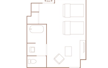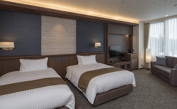 ○障害者対応客室:広さ35m2・定員2名のユニバーサルツインルーム(2階310号室)は、車椅子でのご滞在に配慮した、バリアフリーでゆったりと利用いただけるお部屋(1室)です。入口ドアは引き戸で、幅は85cmです。ベッドサイズは1220mm幅ベッド×2台です。部屋から道後温泉本館がよく見えます。室内各ドアは引き戸で段差はありません。浴室のシャワーチェアが必要な際はフロントに申し出てください。