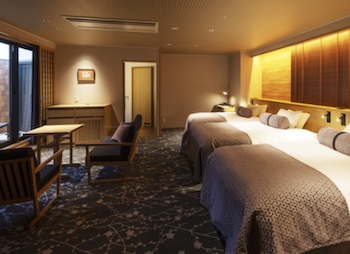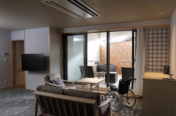 ○バリアフリールーム:車いすで利用できる、ゆすらんユニバーサルルーム(621号・48㎡)はグループやファミリーで宿泊の方にもゆったりプライベート感あふれる滞在を提供して居ます。段差のない「フルフラット」な室内で快適に過せます。セミダブルベッド(シモンズ製マットレス)×4台、温泉外風呂があり。浴室は洗い場もあり、シャワーチェア・移乗台があり。バリアフリーで車椅子のままお部屋にお入りいただける様、広目の通路。※客室から眺望はございません。