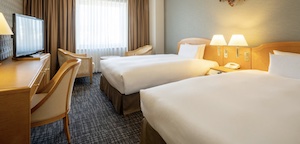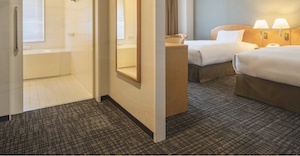 ○段差のなく、広さが28.47m²、定員2名、120×200cmベッドサイズのユニバーサルルーム1室。車いすでのご利用を想定した思いやりスペース。バスルームは浅めに設計されたバスタブとスライドドアを採用し、シャワーチェアと浴槽の脇に腰掛けスペース・手すりがあります。最上階車椅子利用可ご予約・お問い合せはお電話にて。