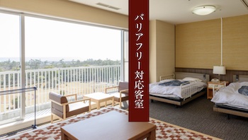 ○障害者対応客室:バリアフリー対応客室は走行リフトで電動ベットから浴室・トイレまで移動可能。広さ約24m²・定員2名・階数4階・ベッド台数は介護支援電動ベッド1台、セミダブルベッド1台。車椅子でも安心してお使いいただけるよう段差をなくし、お風呂・トイレに手摺を設けたバリアフリーのお部屋です。客室からのオーシャンビューに圧巻。すべてのお客さまに快適な空間を。浴室にはシャワーチェア・バスボードがあり。