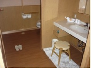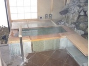 ○貸切風呂には車椅子対応の「ひのき風呂」、シャワーチェア貸出あり(要事前連絡)、浴槽縁が広く、ここに座って移乗入浴できる。