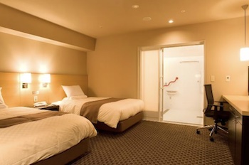 ○障害者対応客室:33㎡・定員:2名のユニバーサルツインルーム。車椅子を利用の方にも快適に滞在頂けるように入り口はスロープとなっており、スムーズに入室が可能です。ベッドサイズ(cm):120cm×195cm。トイレは両側に手摺があり、洗面所は車椅子で利用できます。バスルーム(画像はありません)にはシャワーチェア・バスボード(電話で確認済み)があり。