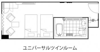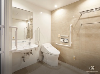○どなたでも快適にご利用いただけるユニバーサルデザインをコンセプトにしたお部屋。バスルームは手すりを設け安全性を重視したユニットバスタイプを採用しております。広さが28.68m²、定員1〜2名、110×203cmベッドサイズのユニバーサルルーム1室。車いすでのご利用を想定した思いやりスペース。貸出備品として、風呂椅子・桶があります。浴槽脇にある腰がかけられる広いスペースと手すりを使って湯船に入れます。
