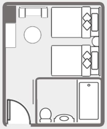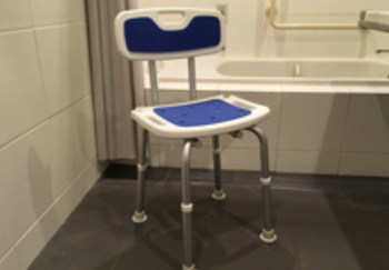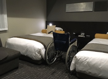 ○バリアフリー対応の27㎡ツインルーム。こちらは1室のみ2階にあり。バスルーム&トイレは車椅子対応。フロント直結の呼出し機能付き。ソファベッド(2名がけソファ)を備え、最大3名様までのご宿泊に対応。貸出備品として、シャワーチェアがあります。浴槽脇にある腰がかけられる広いスペースと手すりを使って湯船に入れます。
