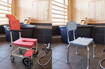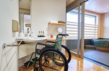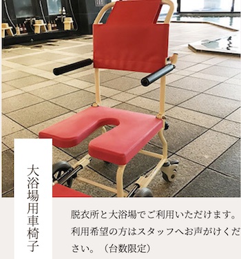 大浴場用車椅子は脱衣所と大浴場でご利用いただけます。浴槽の1箇所に手すりがあります。