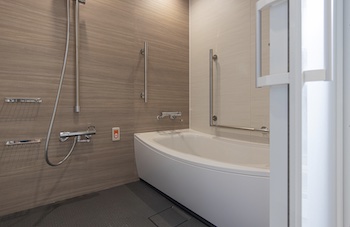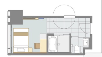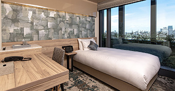 ○バリアフリールーム:22㎡・最大定員1名ユニバーサルシングルルーム(4室)・31㎡・最大定員2名ユニバーサルダブルルーム(1室)があります。ベッドサイズは幅160cm×長さ200cmです。出入り口から客室内へスムーズに移動できる空間を確保。浴槽内、トイレに備え付けられた手すり。浴槽には広い腰掛けスペースがあり、少し歩ける車椅子ユーザーでも湯船に入れます。貸出品としてバスチェア・バスボードがあります。