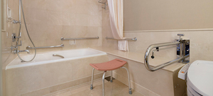 ○障害者対応客室:広さ33㎡・定員:1~2名アクセシブルツインルーム。ベッドサイズ:ツイン120x200cm、バスルームはシャワーチェアーや手摺や浴槽脇腰掛けスペースが完備されたお部屋。ご高齢の方や車椅子をご利用の方が安心してご利用いただける空間。