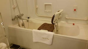 ○障害者対応客室:ユニバーサルツインルーム4室(広さ:36㎡・55㎡・76㎡・77㎡)、バスルーム入口にスロープがあり車いすで入り易い、バスとトイレ間に広いスペース、シャワーチェアがありシャワーの高さも変えられます。ユニバーサルルームの貸出備品:バスタブ用のすべり止めマット・バスタブへの移動台・バスクリップ(バスタブ用の手すり)・バスステップ・シャワーチェア