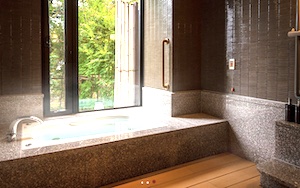 ○障害者対応客室:63㎡バリアフリー対応庭付きジュニアスイート(3室)で利用人数4名です。亀の井ホテル髄一の、ジュニアスイートルームです。すべての方に上質な空間を楽しんでいただきたいというコンセプトで、ジュニアスイートルームにバリアフリーツインをしつらえました。浴槽の縁は広く腰掛けスペースとして使え、手摺もあります。少し歩行ができる方であれば介助者の手助けで安全に浴室内の移動はできるでしょう。温泉ではありません。
