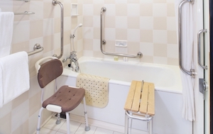 ○障害者対応客室:33㎡のツインルーム(洋室)2室あり。2名様ご利用料金37,228円 ※サービス料・諸税込み(2019年7月1日現在)。廊下からの段差7mm/客室からの段差2mm。浴室内には手すり・入浴台を設置。バリアフリールーム内浴室の段差は2cmありスロープ、入り口幅は車いす対応。