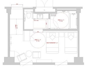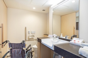 ○障害者対応客室:車椅子利用の方にも安心、快適にお過ごしいただけるようにご用意した36.6㎡ユニバーサルデザインルーム。客室入口、バスルームの扉は開口を80~85㎝確保。室内、バスルーム、トイレは全てフラットになっており、スムーズに移動が可能です。また、バスルームの洗い場は車椅子でも旋回が出来る広いスペースです。トイレは、ストーマを洗浄するハンドシャワーを備え、オスメイトの方も快適に利用できます。ベッドサイズは1200mmx1950mmx2台、定員は1~3名、3名利用の場合はエキストラベッドを用意いたします。