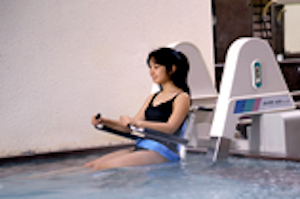 入浴用車椅子(シャワーキャリー)で浴槽内スロープを降りるは脱衣室までは自分の車椅子で行き、浴室の入り口付近で施設専用の入浴用車椅子(シャワーキャリー)に移乗します。浴室内の移動は介助者に押してもらいます。一般的に、浴室の床レベルから浴槽の底に向かうスロープがあり、縁が低く大きな埋め込み式の浴槽にで使われています。スロープを下る方法は手動式と電動式があります。浴室内完結型。