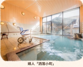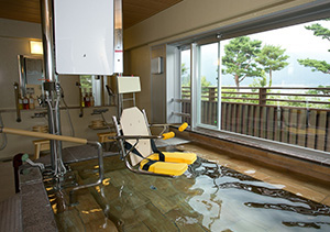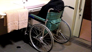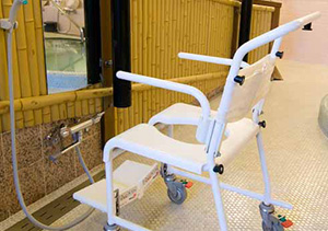 つぎは浴室内安全移動です。客室内のお風呂・貸切風呂は比較的狭く、妻の介助を得ることができ、大浴場は広く不安がありますので、シャワーキャリーか浴室用車椅子・人的サービス提供がある場合のみ、大きな温泉を楽しみます。管理人の経験で1施設だけですが、大浴場に「移動と湯船に浸かれる」シャワーキャリーがあり、その操作を男性従業員が10分置きにしてくれるバリアフリーの宿がありました。