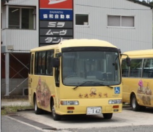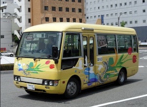 - シャトルバス:観光施設や宿泊施設の無料送迎バス・一部の路線バスで運行されています。イベント会場や空港・観光地など特定の目的地を利用する乗客を効率的に輸送するため、短い間隔で運行するバスです。車両は27人乗りマイクロバスタイプが多く、トランクもなく、可動スロープ・手すりもないので車椅子の方は乗車できません。しかし、稀にはこのタイプのバスに昇降リフトを付けて、送迎バスとして提供しているバリアフリーの宿もあります。管理人は最近松江で利用させていただきました。