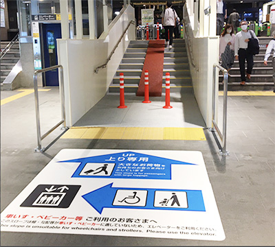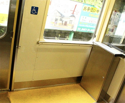 車椅子で電車から降りる際は駅ホームと電車の間に渡り板を設置しますので、駅係員または乗務員にお知らせください。