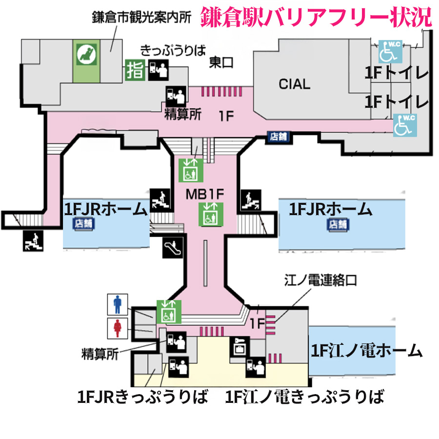鎌倉駅はJR横須賀線(1番線・2番線)と江ノ電が乗り入れているターミナル駅です。駅舎は1階とMB1Fがあり、プラットフォームと駅舎は1階に、東口と西口を繋ぐコンコース(改札内)あります。JRの改札口は東改札口と西改札口があり、江ノ電の改札口は東口とJRからの連絡口があります。1階とMB1F・MB1FとJRプラットフォームの上下移動はエレベーターがあり、MB1FとJRプラットフォームの上下移動は階段とエスカレーターが併設されています。多機能トイレは東口の改札内からと東口の改札外からアクセスできます。
