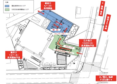 湘南江の島駅には龍口寺への近道「鎌倉口」、江ノ電江ノ島駅への近道「江の島口」、常立寺にアクセスしやすい「藤沢口」があります。改札階は地上5階建てで駅ビルの5階にあるため、バリアフリールートを確保する目的で、エレベーターがあります。エレベーターは、駅ビルの東側にあります。地上階~1階~5階がエレベーターでつながり、バリアフリールートが確保されました。