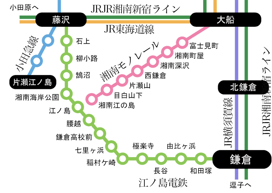 鎌倉の観光地はJR横須賀線(湘南新宿ラインもあり)・江ノ島電鉄・湘南モノレールを鎌倉駅・江ノ島駅・大船駅で繋ぐと一周できます。
