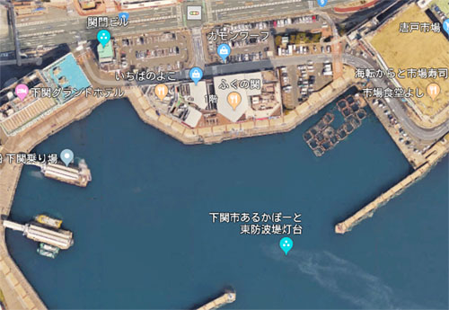 券売所でてすぐ目の前にある1番船着き場が巌流島行き乗り場です。乗組員の手助けを受け車いすのまま乗船し、船尾のバリアフリースペースに行く。フェリーでの航海の途中では自動音声放送で巌流島の由来についてとか関門海峡の両岸の話とか興味深い内容を盛り込んでくれてます。