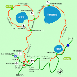 ○霧島屋久国立公園の紅葉はえびの高原・六観音池・大浪池等が例年11月はじめ頃が見頃で、徐々に里へと下りて来ます。えびの高原では是非、白紫池、六観音御池、不動池を周る池めぐりコース(自然研究路)を歩いてみる事をお奨めします。自然研究路は比較的広い舗装道路もありますが、小橋や階段や木の根が露出している狭い未舗装の道もあります。