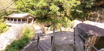 ○両岸の遊歩道は駐車場からゲートをくぐり、食事処の横を通って清掃協力金徴収所から渓谷沿いを歩き始めて40分で最終地点である広河原までです。広河原までの遊歩道整備ができましたので、車椅子でもスムースに移動ができるようになりました。「ハード面においては、バリアフリー化の計画を推進していきたいと思います。自然の状態に余計な造作を加えない従来どおりの方向性は重要ですが、上手に渓谷の景観と融和したバリアフリー施設を設ければ、多くの皆さんに森林浴や飛沫浴を体験する機会を提供できると思います。