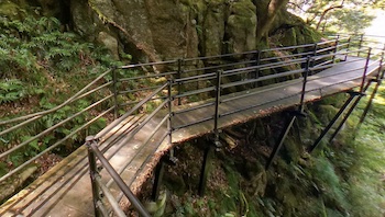 宇根駐車場(車椅子対応トイレもあり)から遊歩道へ遊歩道入口幅80cm、緩やかな下り坂ですが、途中には急な坂道や段差等ありますので介助者が必要です。下高駐車場には車いすトイレやスロープあり、ここから遊歩道へ舟岩剣岩までバリアフリー道があり、絶景が楽しめるバリアフリー道幅140cmです。舌震橋は幅165cm、歩くと振動で橋が揺れます。