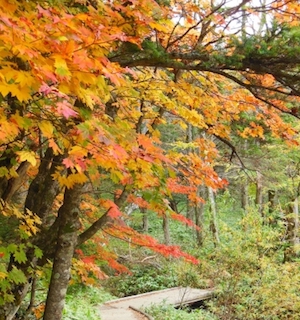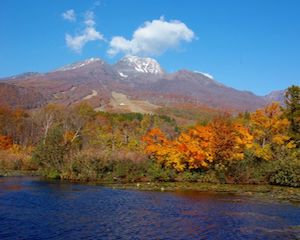 ○上信越高原国立公園の妙高高原・池の平温泉近くのイモリ池一周に所要時間は10分ほどの遊歩道があり、妙高山の紅葉を眺めながらの散策を楽しめます。池を一周する遊歩道はバリヤフリーの整備もされています。いもり池は森林セラピーロードに指定された“妙高高原自然歩道”の中間点にあたります。