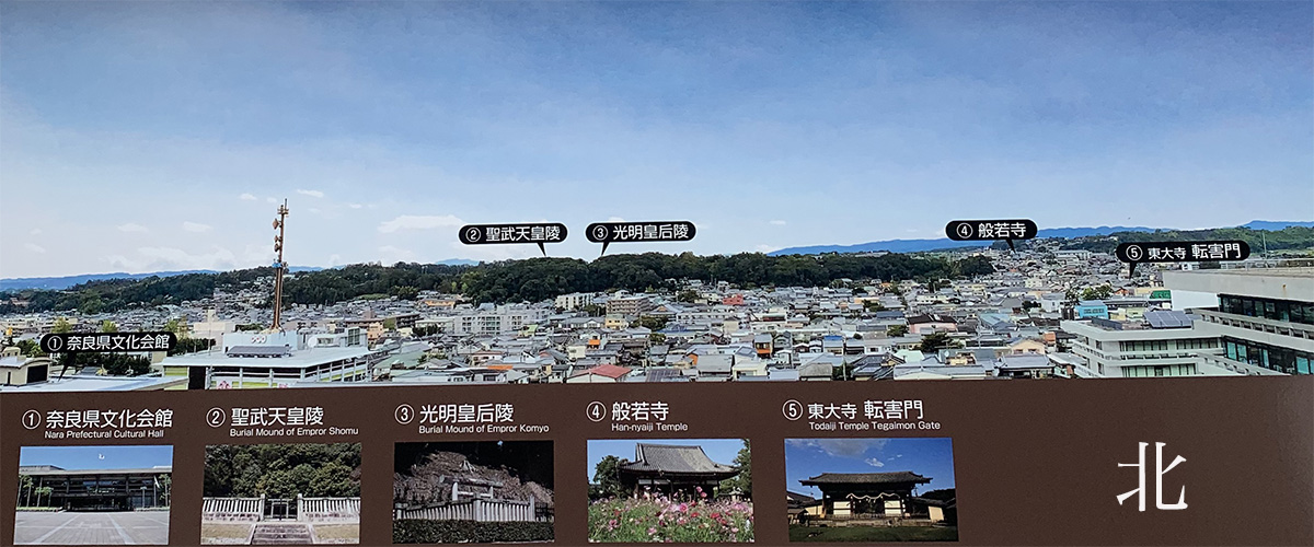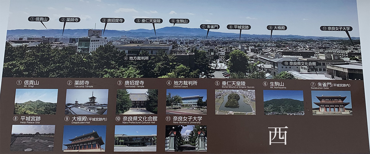 奈良県庁屋上庭園の上に屋上展望台(展望室)があります。屋上階で降りた後、屋上展望台へは階段のみになります。管理人は行くことが出来ませんので、休憩室で待っていました。以下は同伴の介護者の感想です。2階分の階段を上がります。デッキがあって周回出来ます。東大寺の屋根が見えるなど庭園とは違った角度で奈良市を広角的に見ることができます。