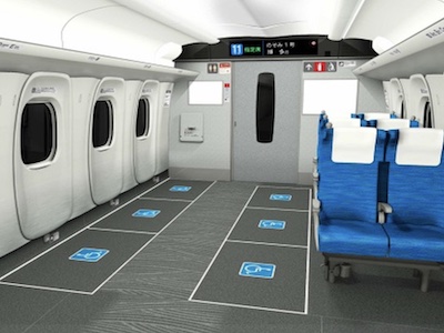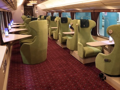 2つ目は11号車の最後尾11列目と12列目と13列目だけは、11A・11Bと12A・12Bと13A・13Bが左側に、右側には11Eと12Eと13Eあり、各列ともC席とD席がありません。6組の車椅子ユーザーが利用できます。(以下では「2席+0席タイプ」と呼称)。