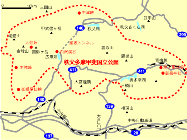 秩父多摩甲斐国立公園は1950年7月10日に国立公園の指定を受けた、埼玉県・東京都・山梨県・長野県の1都3県にまたがる広大な山岳国立公園で、その公園区域面積は12万6259ヘクタールであります。その公園区域は甲武信ヶ岳・国師ヶ岳・金峰山などが連なる奥秩父山稜地域と周辺地区の大菩薩嶺・御岳昇仙峡・奥多摩などで構成されています。