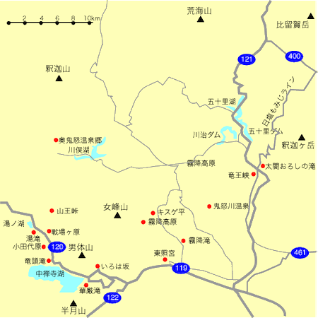 下のイラストで霧降高原が二か所ありますが、川治ダムの下の霧降高原は削除して見てください。