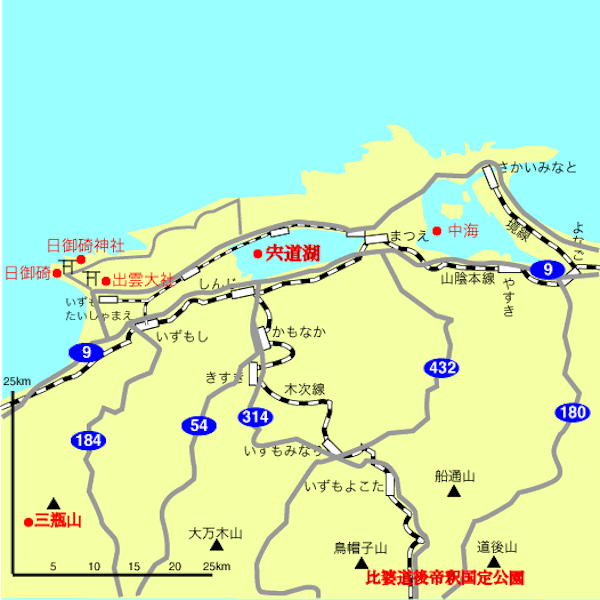 海岸区域は島根半島区域で構成され、複雑な海岸線に断崖や洞門、洞窟などからなる景観が見られます。また、この地域には信仰の地である、出雲大社や日御崎神社などがあり多くの参拝者が訪れています。