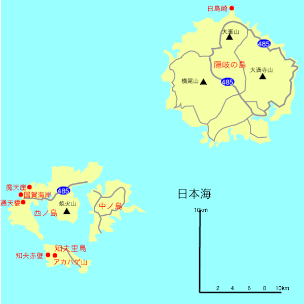外海多島区域は総延長300kmにおよぶ海岸線を持つ隠岐諸島です。隠岐諸島の北側は200mを超す断崖や洞門、洞窟などからなる景観が見られます。