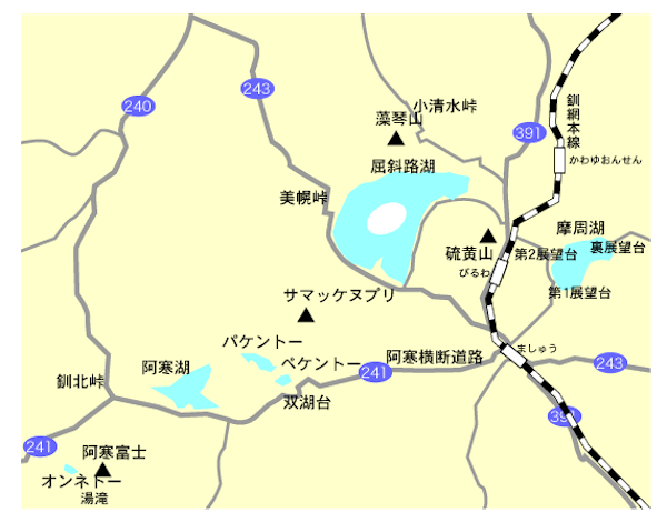 阿寒国立公園は1934年12月4日に国立公園の指定を受け、道東中央部に位置し阿寒・屈斜路・摩周のカルデラ地形を基盤としています。阿寒国立公園内には雌阿寒岳・雄阿寒岳・硫黄山・サマッケヌプリなどの火山と摩周湖・屈斜路湖・阿寒湖・パンケトー・ペンケトー・オンネトーなどの湖が散在しています。また、この地域には温泉が豊富に湧き、強酸性の硫黄泉で有名な川湯温泉をはじめ、仁伏・砂湯・池の湯・和琴温泉などがあります。阿寒一帯で見られる高山植物は豊富で、「アカン」の名を冠する高山植物も多い。国の天然記念物になっているマリモが生息しています。下記の地図の「第2展望台」は「摩周第3展望台」に訂正します。