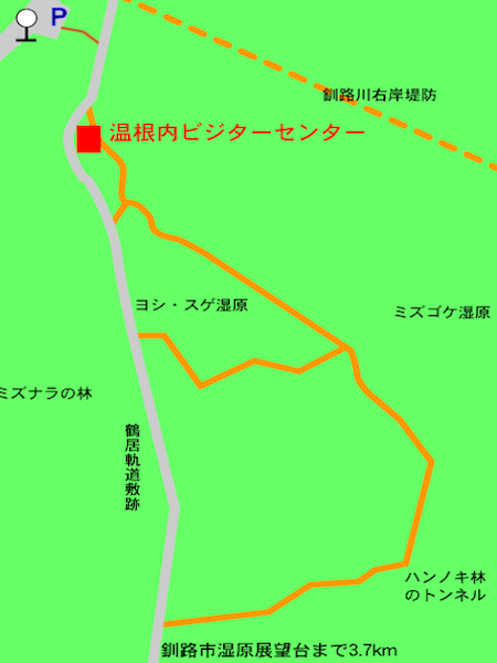 温根内ビジターセンターの木道は釧路市の中心部から車やバスで30分、道道釧路鶴居線沿いのバス停留所(温根内ビジターセンター)の近くに駐車場があります。駐車場に車を止めて雑木林の中を抜けると温根内ビジターセンターがあります。この温根内ビジターセンターが木道の起点で、木道(車椅子も通れ全長約2km)と遊歩道を一週する所要時間は約1時間です。