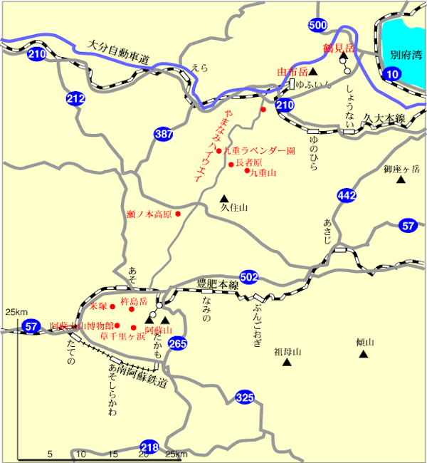阿蘇くじゅう国立公園はやまなみハイウエイなどの道路網が整備され、久大本線と豊肥本線の間に位置しています。景観を楽しむドライブ・温泉保養として障害者や高齢者などのハンディにも人気があります。