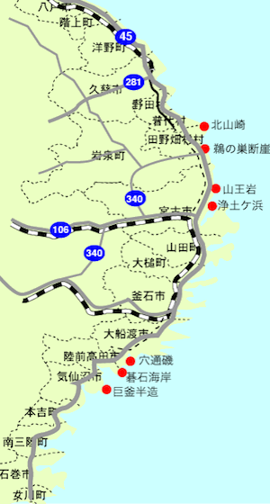 この細長い海岸線へのアクセスは道路と鉄道になります。道路は国道45号線が海岸に沿って南北に貫通しています。岩手県や宮城県の中心部からは106号線や107号線281号線、283号線でアクセスします。鉄道の場合、北部には八戸線や岩泉線と三陸鉄道北リアス線で、南部には釜石線や山田線と三陸鉄道南リアス線でアクセスします。