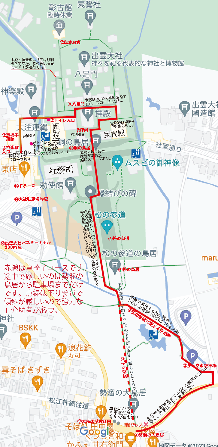 出雲大社境内への入口は主に3箇所あります。メインは勢溜の鳥居(第二鳥居)から下り参道を殆どの参拝者がここから境内に向かいます。二つ目(境内図の濃い紫色のライン)は勢溜(第二鳥居)の東側にある「かめやま駐車場」から境内に向かいます。「かめやま駐車場」は勢溜(第二鳥居)よりも低く、概ね祓橋と同じレベルにあります。ここから概ね平坦なルートで松の参道の鳥居の前に出ます。このルートですと下り参道は通りません。しかし、勢溜の鳥居からかめやま駐車場までは、約3.5%の傾斜ですが、230mほど続きますので注意して走行しましょう。三つ目(境内図の濃い緑色のライン)はさざれ石がある西側駐車場からスロープを通って、神楽殿・御本殿・拝殿を参拝して、松の参道を抜けると、勢溜の鳥居へ向かう厳しい登りの下り参道か、概ね平坦な祓橋からかめやま駐車場へのルートを選択しなければなりません。
