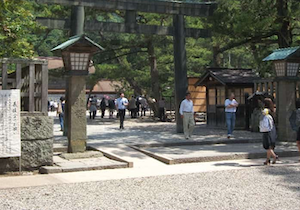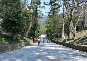 小川にかかる太鼓橋「祓橋」を超えると、松の参道が拝殿まで続いています。松の参道の中央の路は、昔は皇族や貴族だけが歩く参道であり、 一般の人は左右を歩くようになっていました。現在は松の木の根を保護するため、松の中央を歩く事はできず、左右の路を歩くようになっています。この間は路面も良く、ほぼ平坦で車椅子走行に問題はありません。