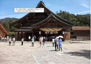 出雲大社境内の大まかなレベルは御本殿が標高7m、祓橋付近が標高3m、勢溜の鳥居が標高13mとなっております。それらの段差を埋めるために、7箇所に階段・スロープがあります。7箇所中スロープがない場所は、勢溜の鳥居と御本殿の2箇所です。