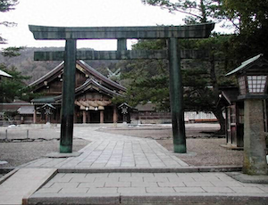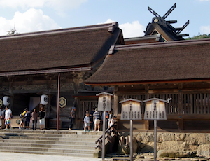 御本殿は瑞垣と玉垣に囲まれ、瑞垣内は荘厳な神域なので通常は入れません。しかし、瑞垣の周囲はぐるりと車椅子でも走行できる、平坦な石畳舗装ですので、一回り走行し、いろいろな場所から御本殿に向かってお参りできます。御本殿から回って行くと、真後ろには大国主大神の親神でありヤマタノオロチ退治で有名な、スサノオノミコトをお祀りする素鵞社(そがのやしろ)があります。素鵞社の背後には、出雲大社を見守る八雲山の岩がせり出しています。ここはその聖なる山に触れることができる唯一の場所で、岩に触れると不思議な御力を感じる人もいるそうです。