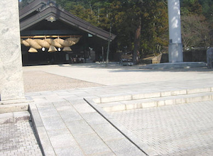 庁舎の脇を通って神楽殿に向かいます。素鵞川(そががわ)に掛かる小さな橋を渡ると、神楽殿が見えてきます。神楽殿の御守り所・お賽銭箱・案内所は庭から2段ほど上がった所にありますが、両側にスロープがあり、西側のスロープの先には車椅子用通路が出口まで繋がり、道路との段差を解消するスロープがあり、車椅子でも砂利舗装を避けて行動できます。